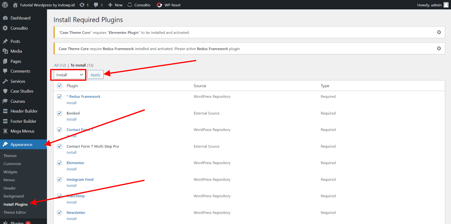 Jika 4 plugins tadi sudah terinstall dan aktif selanjut kita install semua plugin Requirednya ada dimenu Appearance > install plugins. centang semua list plugin yang ada lalu install dan aktifkan semua.