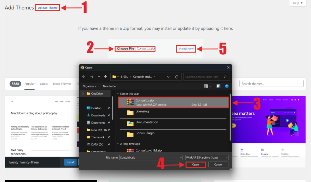 4.) Lalu kita lanjut Upload dan Install file theme, Ikuti langkah pada gambar 2 – 2 diatas, Pertama kita Pilih Upload > Kedua pilih Choose File > Ketiga pilih file didalam folder Exstarct > lalu lanjut kita pilih Open > lalu kita lanjut Kelima Pilih Install Now, setelah itu kita tunggu proses penginstallan theme Consultix.