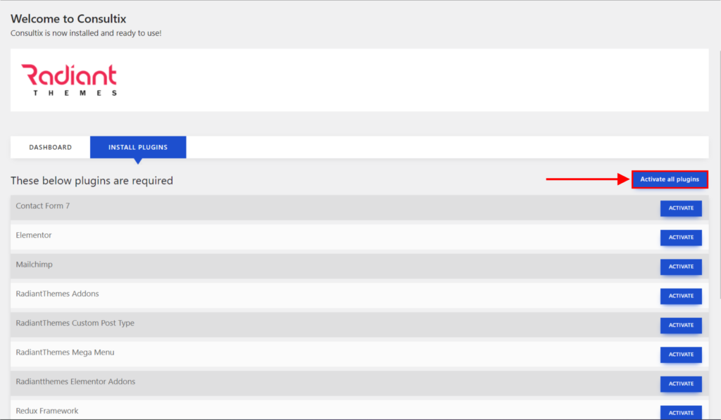 6.) Setelah kita Activate theme Consultix, maka kita kan otomatis di bawa ke Dasboard Themenya lalu selanjutnya kita akan menginstalll plugin, Perta kita Click > Begin Installing Plugin, yang di tunjuk panah merah pada gambar 3 – 1 diatas