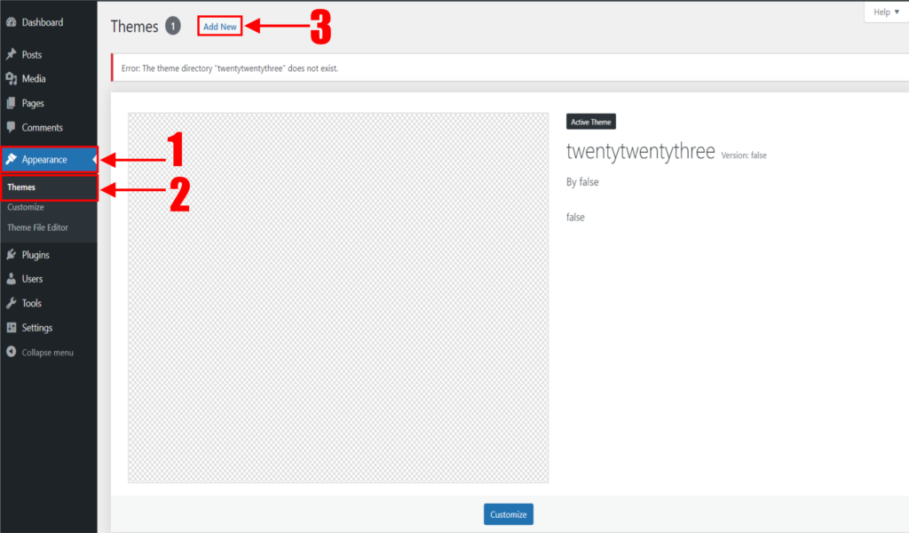 3.) Masuk ke dalam langakah kedua, di sini kita akan Install File theme Munfarid yang kita beli dari indonesia.wp, lalu mari kita ikuti langakah – langakah seperti gambar 2 – 1. pertama setelah login ke Dasboard wp-admin, lalu cari menu Appearence > themes > lalu pilih Add New