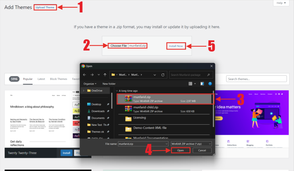 4.) Lalu ikuti langkah berikutnya seperti gambar 2 -2, Pertama kita pilih Upload Theme > lalu kedua Choose File > Ketiga pilih file Theme di dalam folder Exstract > lalu Keempat Click Open > dan Kelima Install Now, lalau tunggu hingga Theme berhasil terinstall,