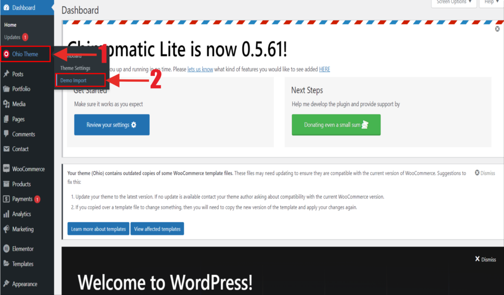 11.) Setelah itu kita masuk ke Install Demo Content perhatikan gambar 4 -2 diatas, Pertama kita ke Menu Appearence > lalu Kedua pilih Import Demo Data