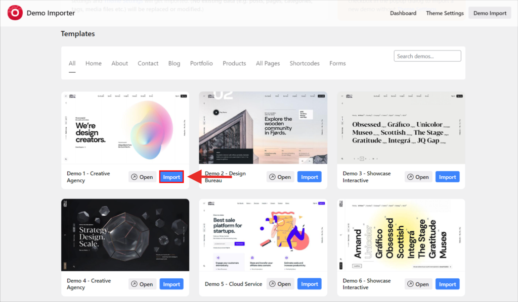 12.) Selanjutnya kita akan masuk ke page Import Demo, lalu pilih Demo Content yang ingin kita gunakan pada Webiste kita, setelah selesai memilih Demo Content, langsung saja, Click > Import Demo.