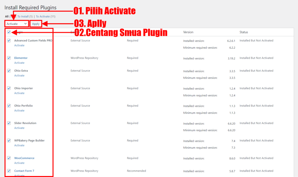 9.) Lalu setelah kita kembali ke page penginstall plugin, lalu kitaakan mengaktifkan semua plugin yang telah terinstall, Perhatikan langkahnya pada gambar 3 – 4 diatas. Pertama kita centang semua Plugin > lalu kedua pilih Activate > lalu ketiga Apply.