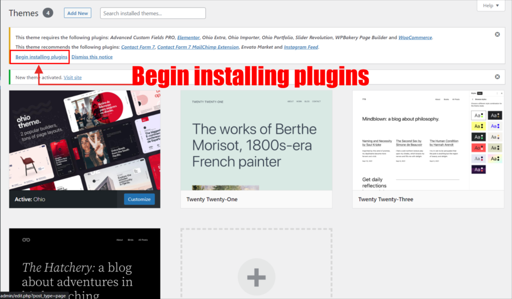 6.) Setelah kita Activate theme Ohio, maka kita kan otomatis di bawa ke Dasboard Themenya lalu selanjutnya kita akan menginstalll plugin, Pertama kita Click > Begin Installing Plugin, yang di tunjuk panah merah pada gambar 3 – 1 diatas