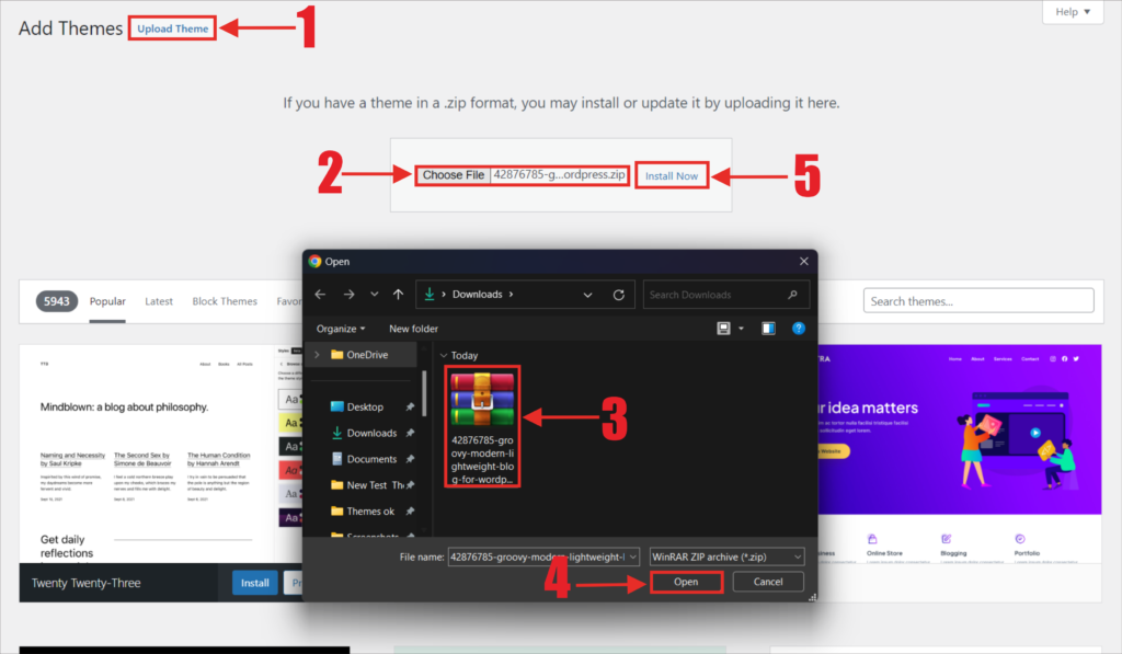 2.) Lalu kita lanjut Upload dan Install file theme, Ikuti langkah pada gambar 2 – 2 diatas, Pertama kita Pilih Upload > Kedua pilih Choose File > Ketiga pilih file didalam folder Exstarct > lalu lanjut kita pilih Open > lalu kita lanjut Kelima Pilih Install Now, setelah itu kita tunggu proses penginstallan theme Groovy.