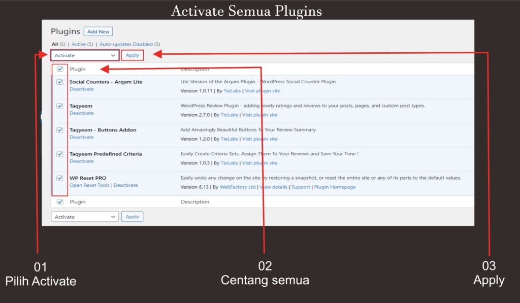 Jika proses penginstalan sudah seleseai kita akan mengaktifkan pluginya, kita bisa ikuti cara seperti gambar di atas Pertama Pilih Activate > lalu pilih Centang Semua > terakir Apply, dan kita tunggu sampai proses pemasangan selesai.