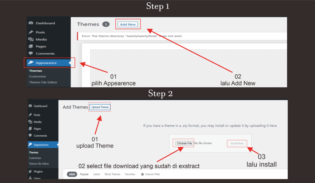 Lalu lanjut ke langkah ke dua lalu login ke wp-admin lalu ikuti instruksi pada gambar pada Step 1 di atas cari menu Appearence > Themes pada menu dasboard lalu lihat panah yang di tunjuk 02 Add New