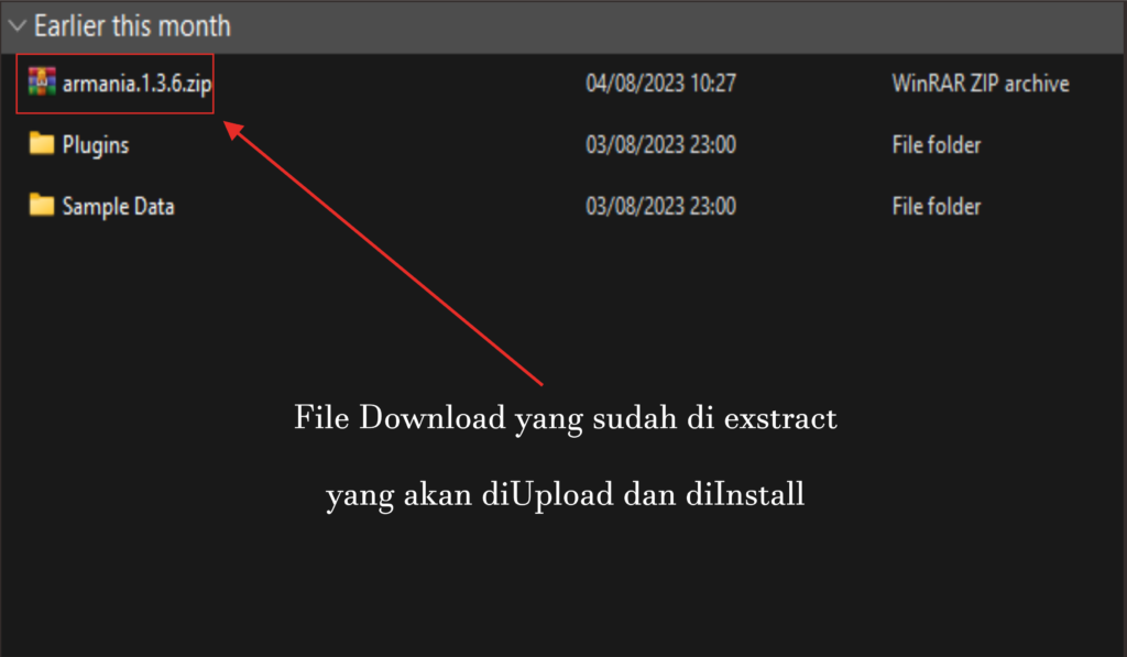 Setelah membuka file Exstract nanti akan ada Folder Armania Theme lalu di dalam folder tersebut ada file armania.zip.yang nanti akan di Upload untuk di Install seperti gambar dia atas yang di tunjuk oleh panah merah