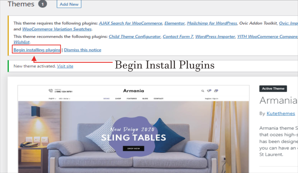 Masuk pada langkah ke tiga setelah kita berhasil mengaktifkan theme Armania, selanjutnya kita akan mengaktifakn puligins pada tema tersebut, untuk mengaktifkan fitur dan conten yang ada pada Theme Armania, Pertama Click Begin Install Plugins seperti gambar di atas .