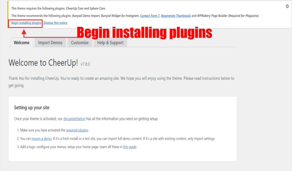 6.) Setelah kita Activate Theme CheerUp maka kita kan otomatis di bawa ke Dasboard Themenya lalu selanjutnya kita akan menginstall plugin, Pertama kita Click > Begin Installing Plugin, yang di tunjuk panah merah pada gambar 3 – 1 diatas