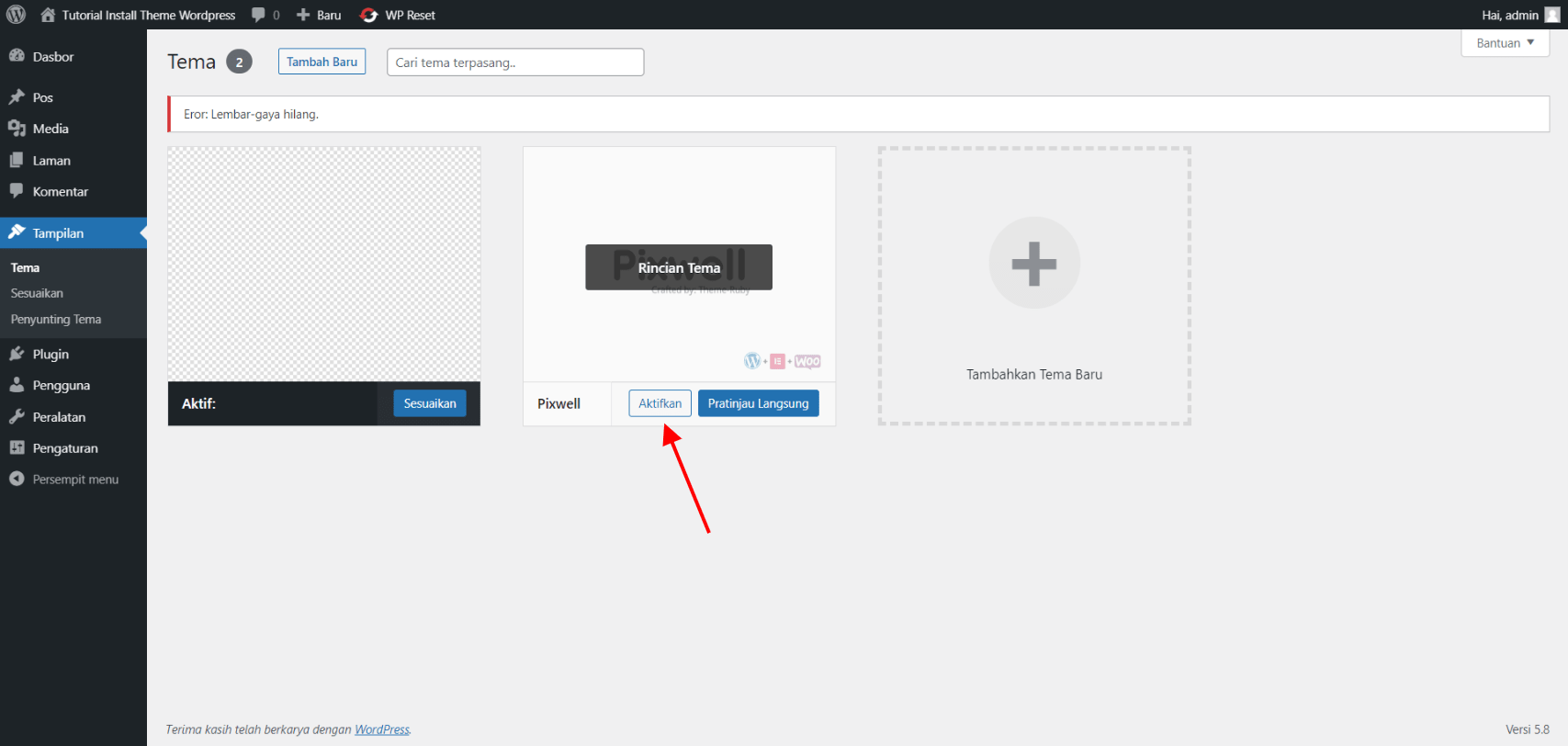 buka folder hasil extract tadi lalu cari file pixwell.zip, file ini lah yang akan di upload atau di install. jika gagal install pada dashboard admin wordpress, kita bisa upload filenya di cpanel : Cara install theme wordpress dari cpanel. setelah sukses upload atau install themenya kita langsung aktifkan saja, cek gambar dibawah.