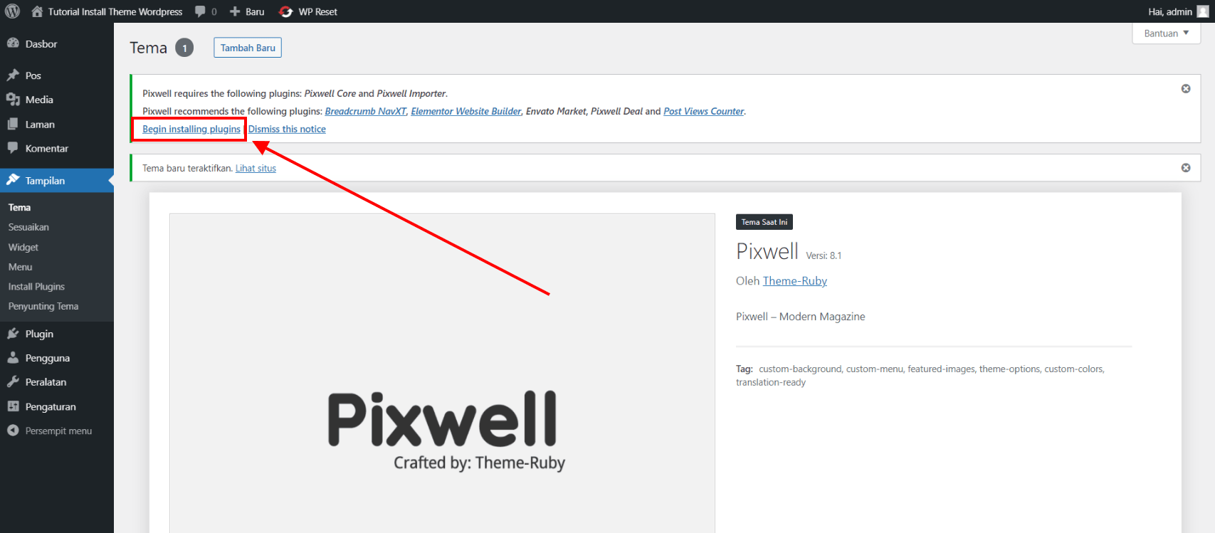Setelah klik “aktifkan” silahkan install dan aktifkan plugin bawaan dari theme pixwell tersebut.