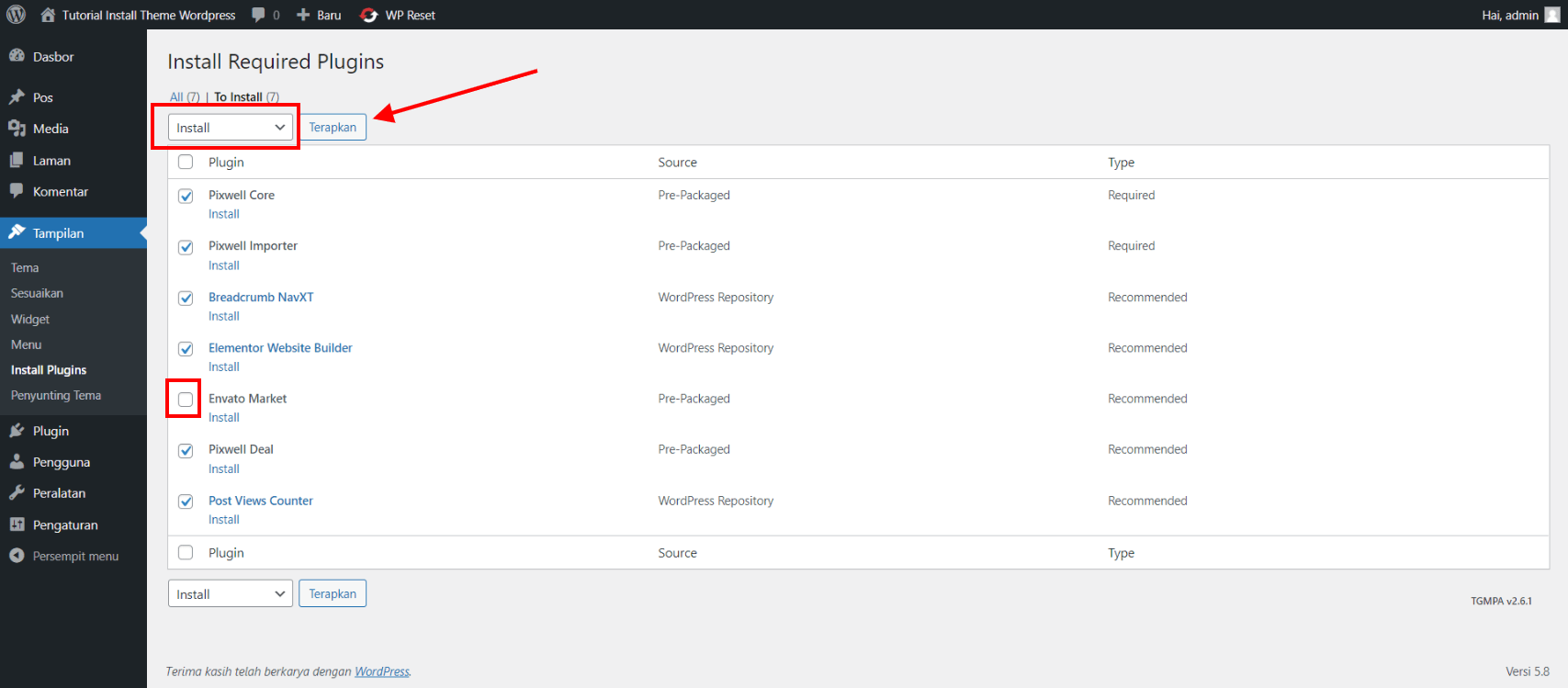 Di sini kita wajib install plugin bawaan dari theme pixwell itu sendiri terutama yang “Required” dan tidak perlu diinstall plugin “Envato Market”