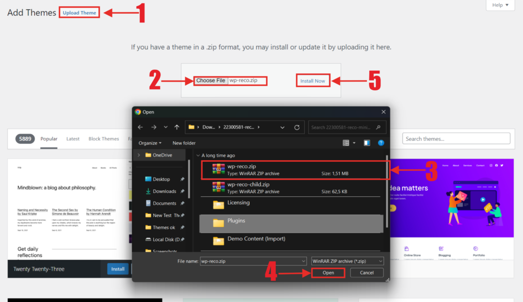 4.) Selanjutnya kita akan Upload dan Install filenya, perhatikan langkah – langkah pada gambar 2 – 2 diatas, Petama kita Click Upload Theme > lalu kedua Choose File > lalu ketiga pilih File di dalam folder Exstract tadi > keempat Open file > dan kelima Install Now, lalu kita tunggu beberapa saat sampai file terintall