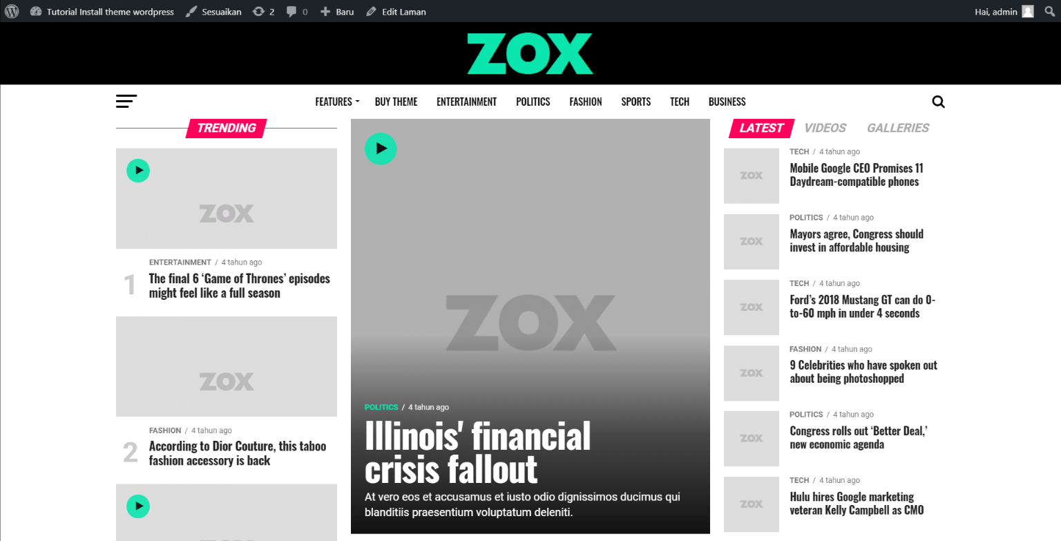 Sampai disini jika halaman home tidak seperti demo kita bisa langsung cek menu “tampilan” > “Zox News Options”