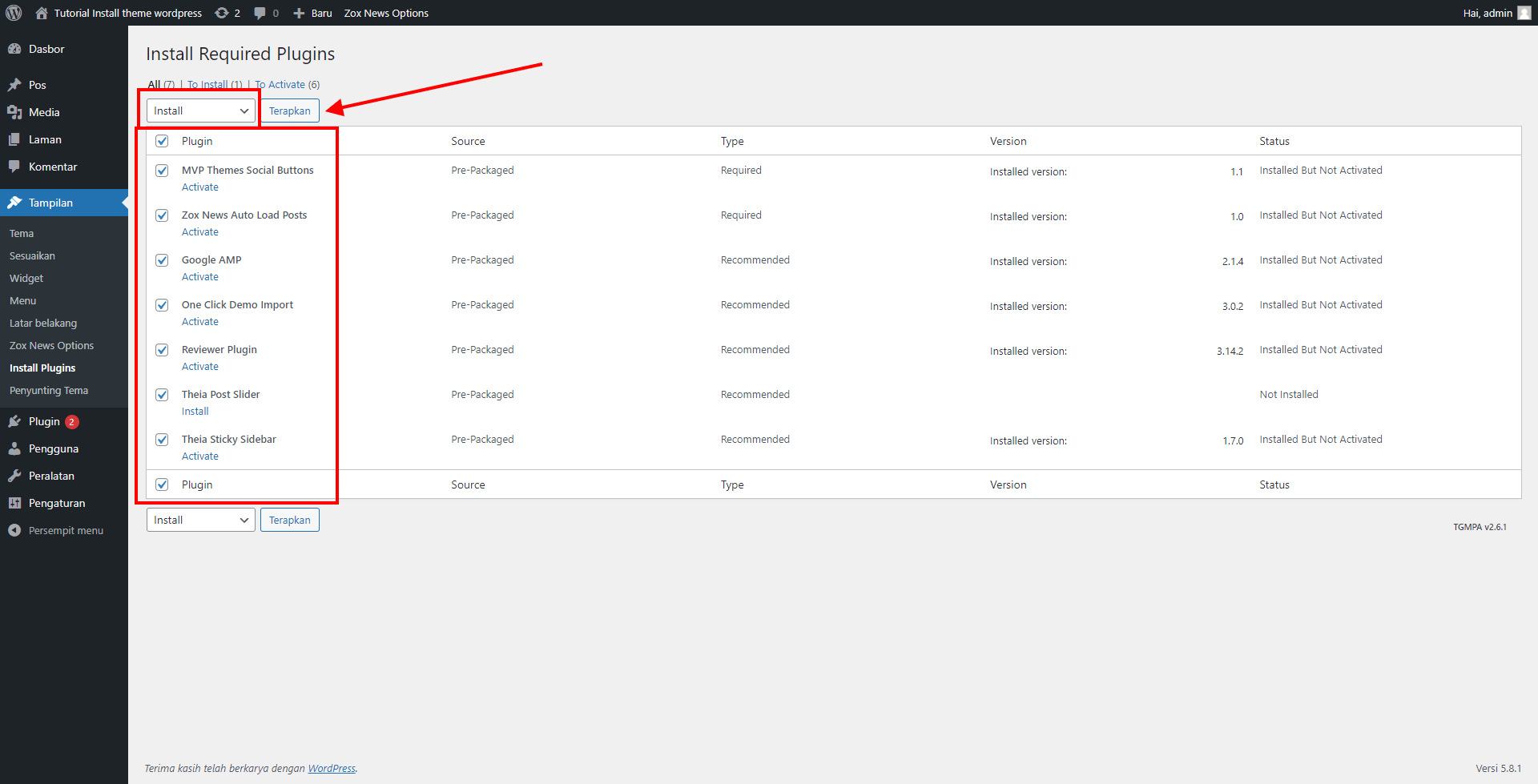 theme yang sudah di upload / diinstall jangan lupa untuk di aktifkan. setelah theme aktif install semua plugin yang tersedia di dalam file yang telah di download dari kodingku.in, didalam folder “Plugins”. nanti bisa disable jika pluginnya memang tidak digunakan.