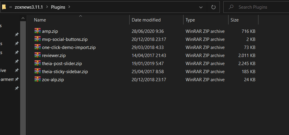 File theme yang telah di extract didalamnya ada file zox-news.zip (file theme) yang akan kita install/upload, dan juga nanti ada folder “plugins” dimana ada beberapa plugin yang wajib nanti kita install (plugin requirednya).