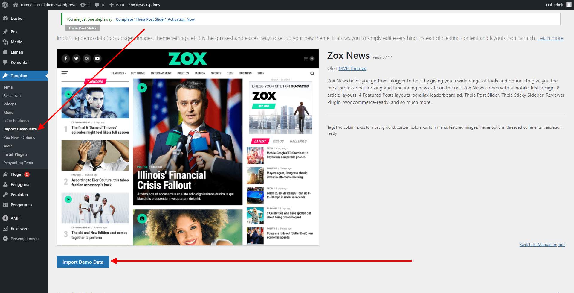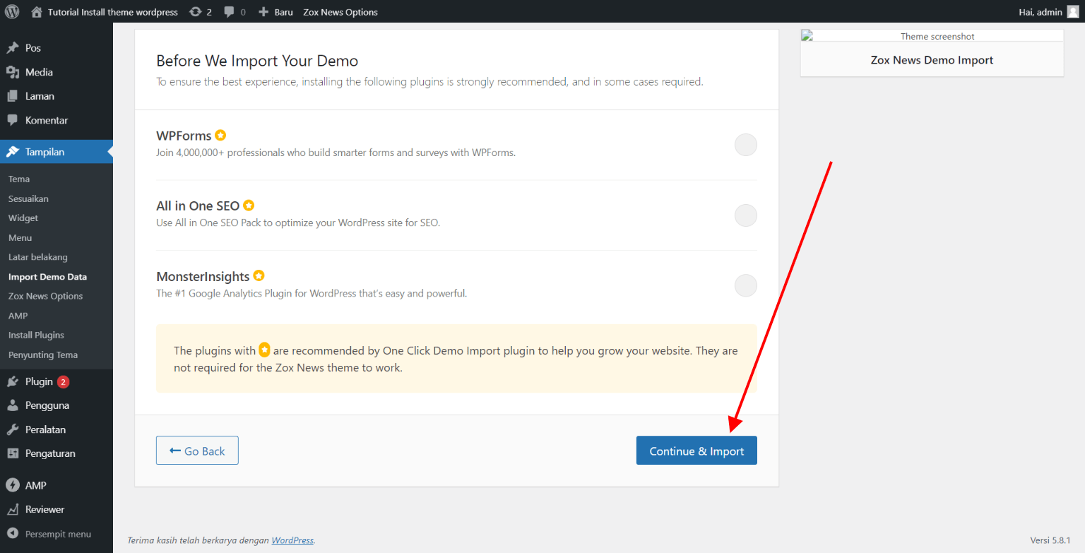Setelah semua plugin terinstall jangan lupa untuk segera aktifkan semua pluginnya. setelah semua plugin aktif saatnya kita bisa langsung import demonya.