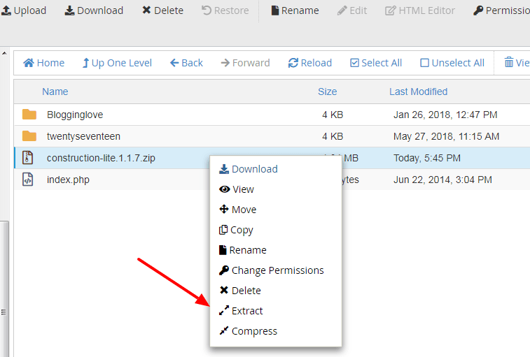 Pada gambar 6 diatas melihatkan file zip theme sudah berhasil di upload, selanjutnya klik kanan dan pilih menu “Extract” (lihat tanda panah pada gambar 6)