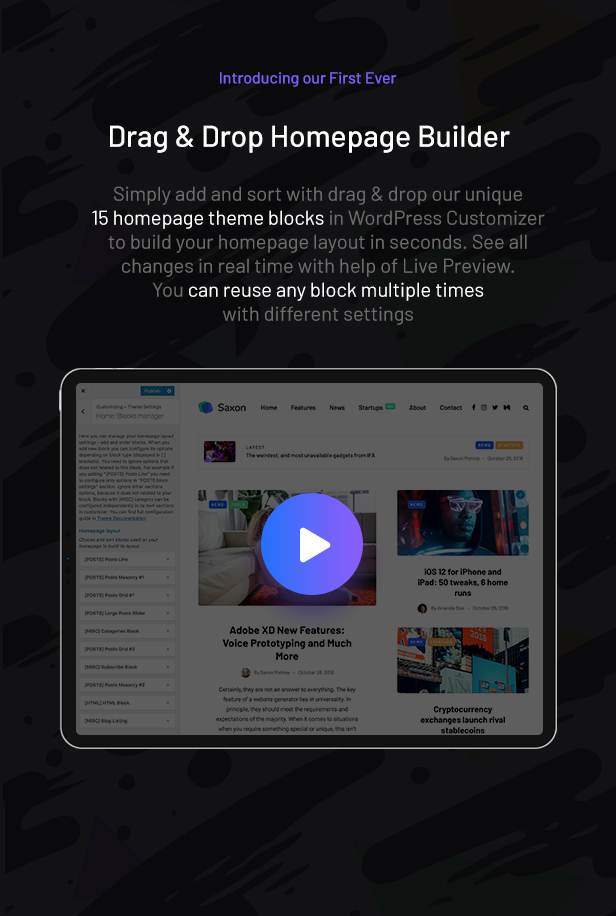 Bangun situs web blogging apa pun dengan mudah menggunakan pratinjau Penyesuai WordPress real-time dan 27 blok beranda yang dapat digunakan kembali dengan drag and drop,