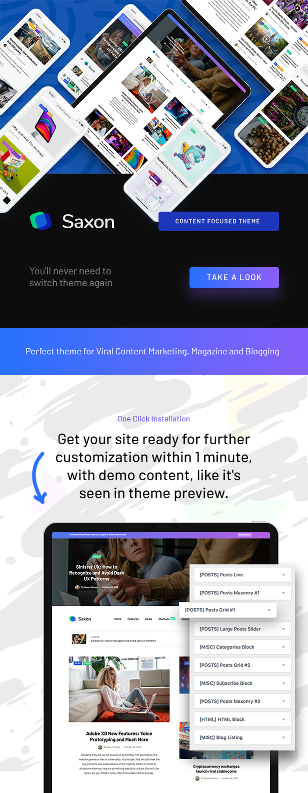 sesuaikan tema Anda menggunakan beberapa Pengaturan Tema dengan pratinjau waktu nyata di penyesuai WordPress, navigasikan dalam postingan blog tanpa mengulang halaman memuat dengan fitur Ajax Load More, impor situs web demo apa pun dengan 1 klik… Daftar fitur baru Saxon yang luar biasa terus bertambah!